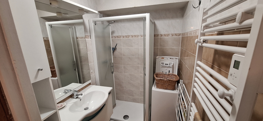 2ème étage. Salon avec clic-clac, chambre, avec grand lit double (couette) et deux lits superposés (couettes). Salle de bain avec douche, lavabo, sèche serviette, wc séparés.