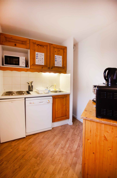 Coin cuisine : plaques électriques 4 feux, four, micro-ondes, réfrigérateur, lave-vaisselle et tout le nécessaire de vaisselle